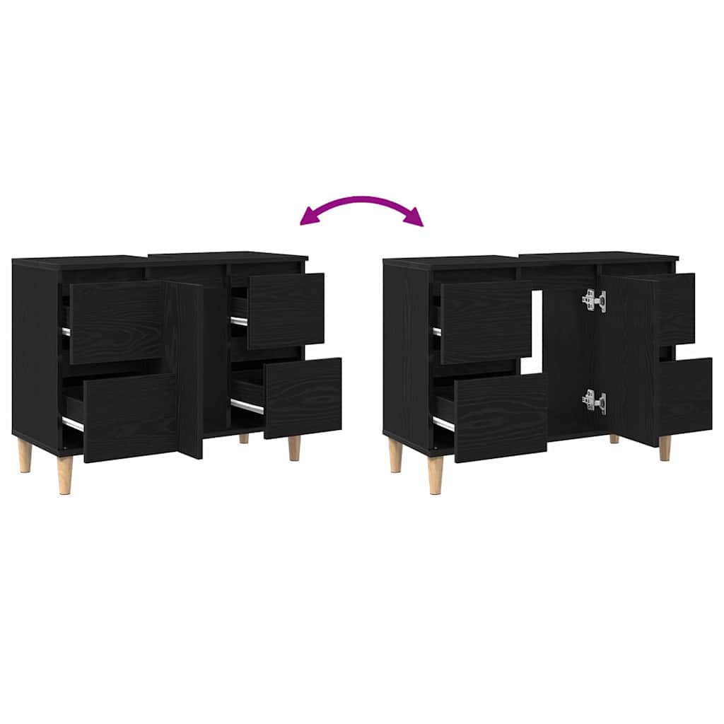 Dieser moderne Waschtisch strahlt Eleganz aus und ist perfekt für jedes Bad. Mit seinem auffälligen Finish in schwarzer Eiche verbessert er nicht nur das Aussehen deines Raumes, sondern unterstützt auch deine Grooming- und Make-up-Routinen. Das Design hat eine schöne texturierte Oberfläche, die deinem Zuhause Tiefe und einen Hauch von Klasse gibt. Viel Stauraum mit zwei Schubladen und zwei Türen hält alles organisiert und leicht erreichbar. Die verstellbaren Regale lassen dich den Innenraum nach deinem Bedarf gestalten, was es flexibel für verschiedene Toilettenartikel macht. Dieser Waschtisch ist für den Innenbereich gedacht und passt perfekt zu modernen Badezimmerstyles. Hergestellt aus solidem Holzwerkstoff, ist er stabil und robust und kann problemlos bis zu 50 Kilogramm tragen.