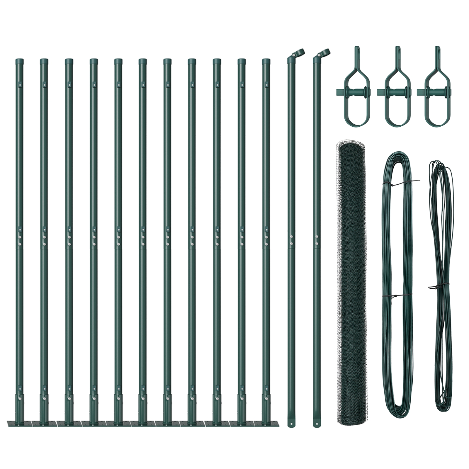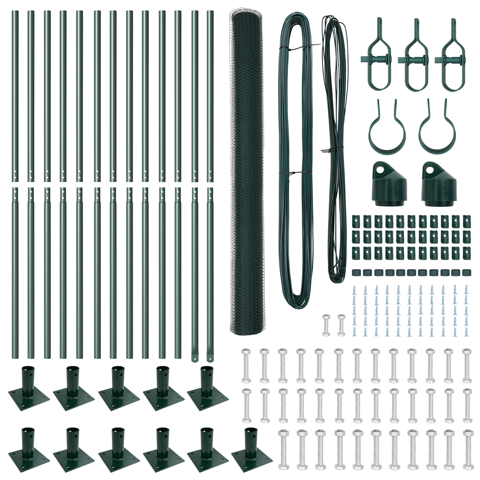 - Lieferumfang: Set von Zaunpfosten, grüne Maschenrolle, Montageschlaufen, Bindeband
