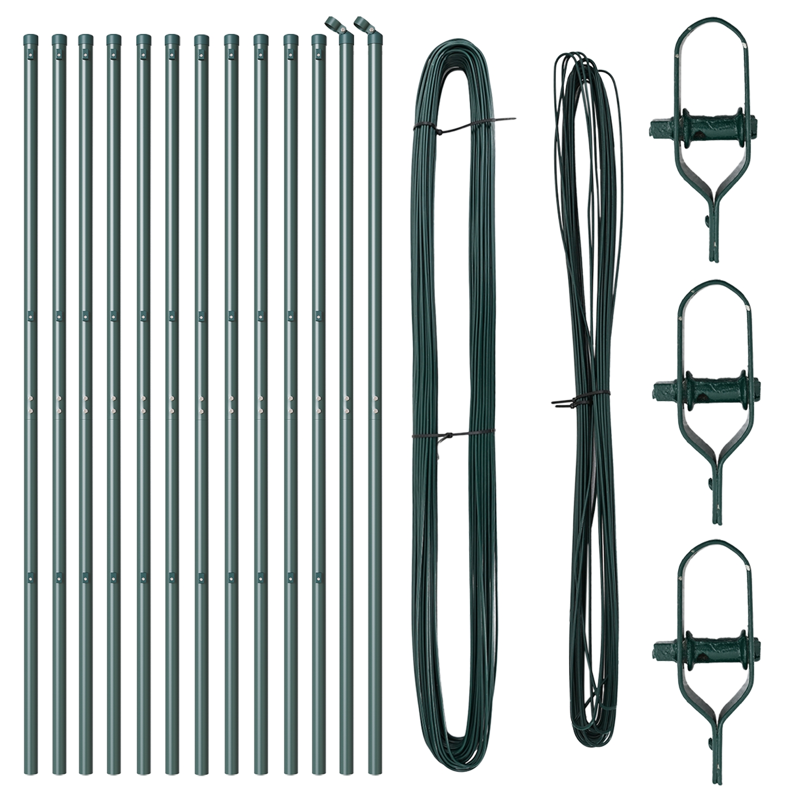 - Lieferumfang: 11 x Pfosten, 2 x Winkelpfosten, 11 x Plastikdeckel, 33 x Plastik-Spanndraht-Tester, 2 x Winkelpfosten-Kappen, 2 x Winkelpfosten-Beschläge, 3 x Spannvorrichtung, 1 x 25 m Bindedraht, 1 x 80 m Spanndraht