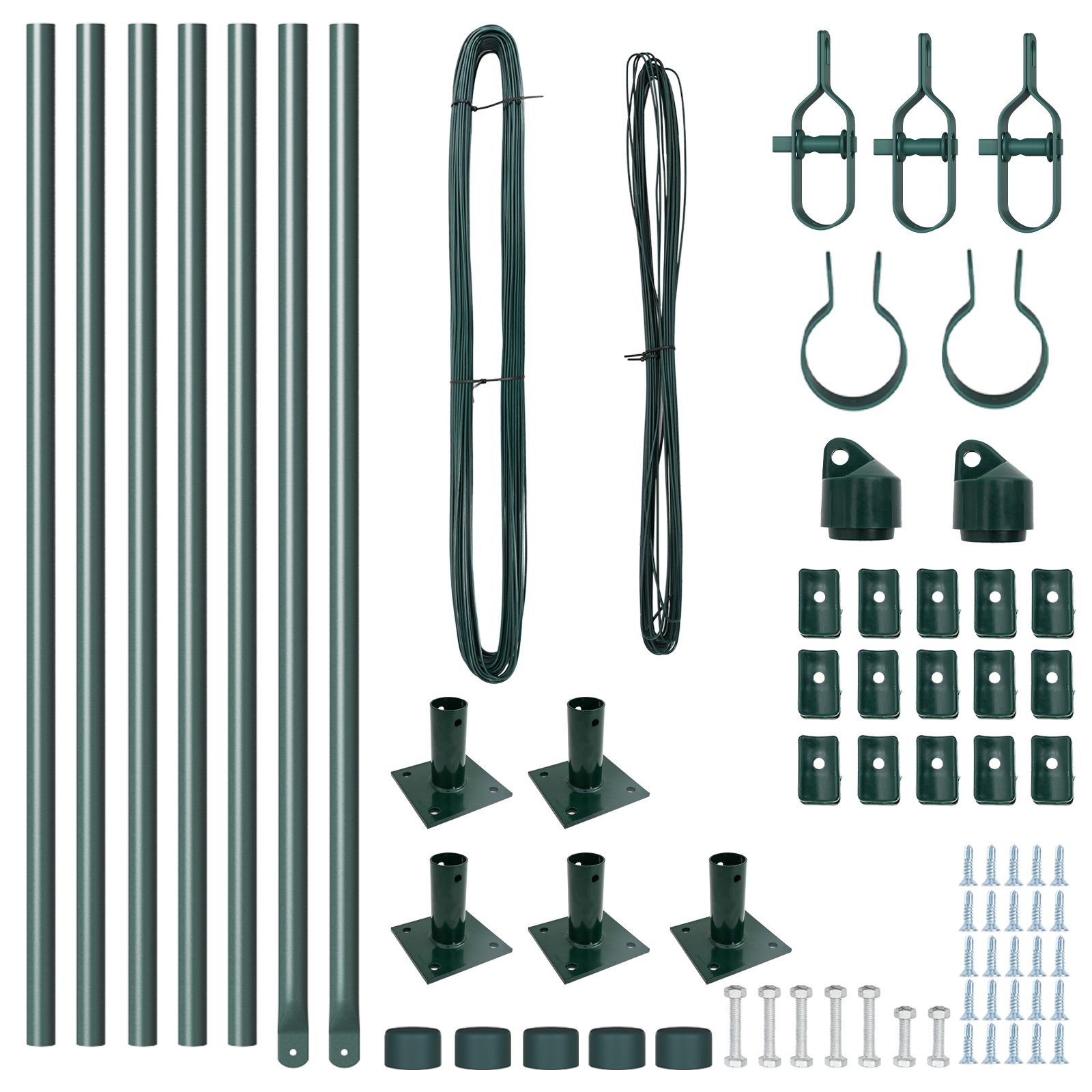 - Lieferumfang: 5 x Pfosten, 2 x Winkelpfosten, 5 x Basisplatte, 5 x Kunststoffkappe, 15 x Kunststoffspannseilstütze, 2 x Winkelpfostenkappe, 2 x Winkelpfostenbeschläge, 3 x Spannvorrichtung, 1 x 25 m Bindedraht, 1 x 33 m Spannseil