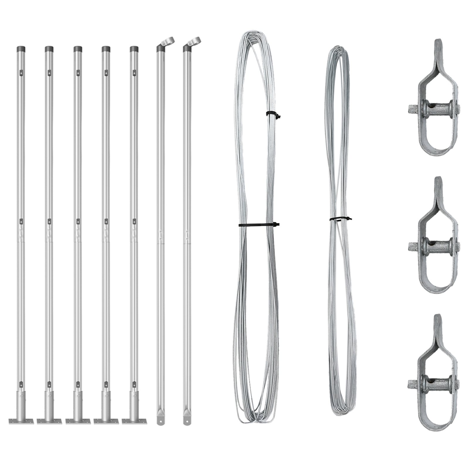 - Lieferumfang: 5 x Pfosten, 2 x Winkeleinsatz, 5 x Basisplatte, 5 x Kunststoffkappe, 15 x Kunststoff-Spannwiderstand, 2 x Winkeleinsatzkappe, 2 x Winkeleinsatz-Hardware, 3 x Spannmechanismus, 1 x 25 m Bindedraht, 1 x 33 m Spanndraht