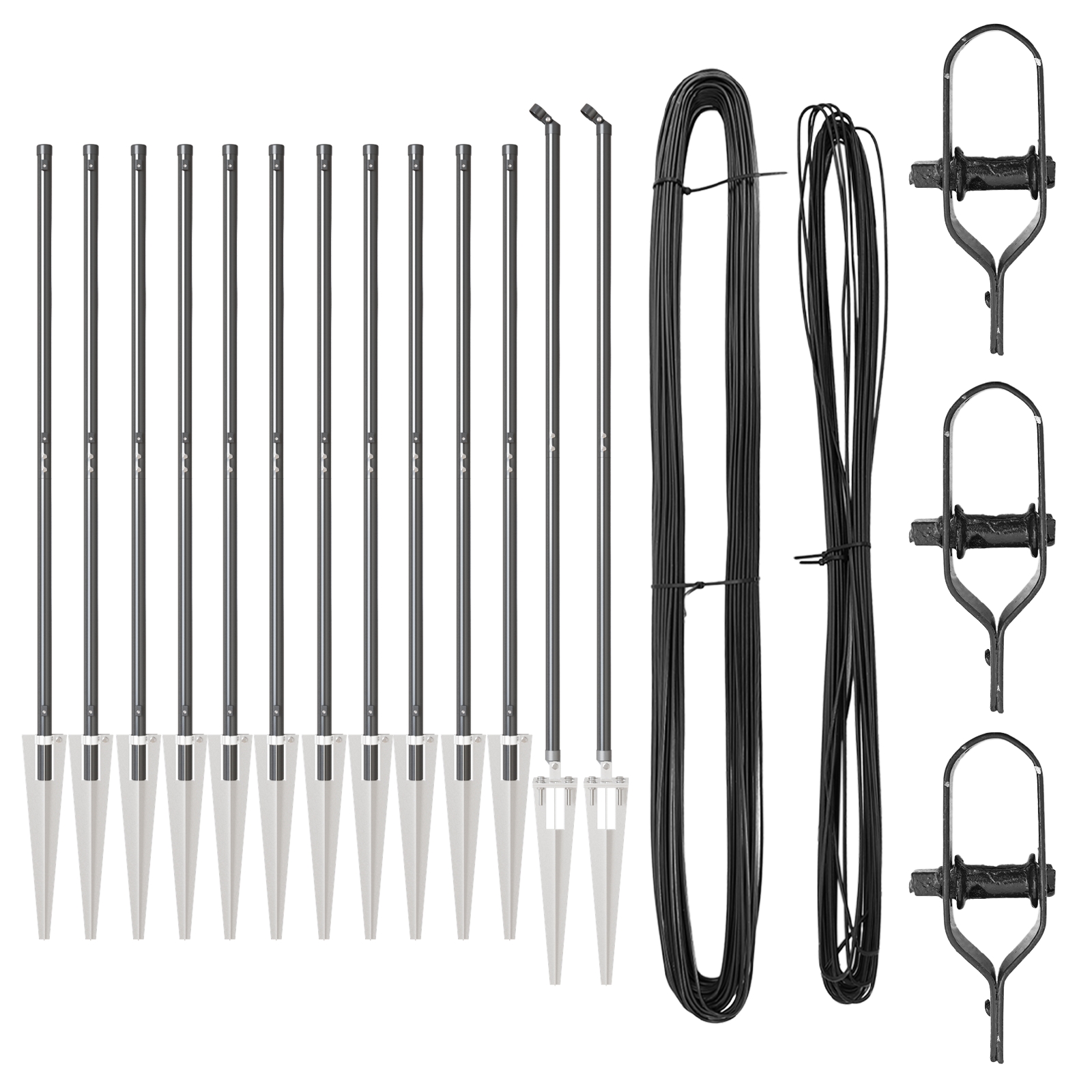 - Lieferumfang: 11 x Pfosten, 2 x Winkelpfosten, 11 x Spike, 2 x Winkelspike, 11 x Plastikdeckel, 33 x Unterstützer für Plastikspanndraht, 33 x Schraube auf dem Plastikunterstützer, 2 x Winkelpfostenkappe, 2 x Winkelpfosten-Hardware, 3 x Spannvorrichtung, 1 x 25m Bindedraht, 1 x 80m Spanndraht