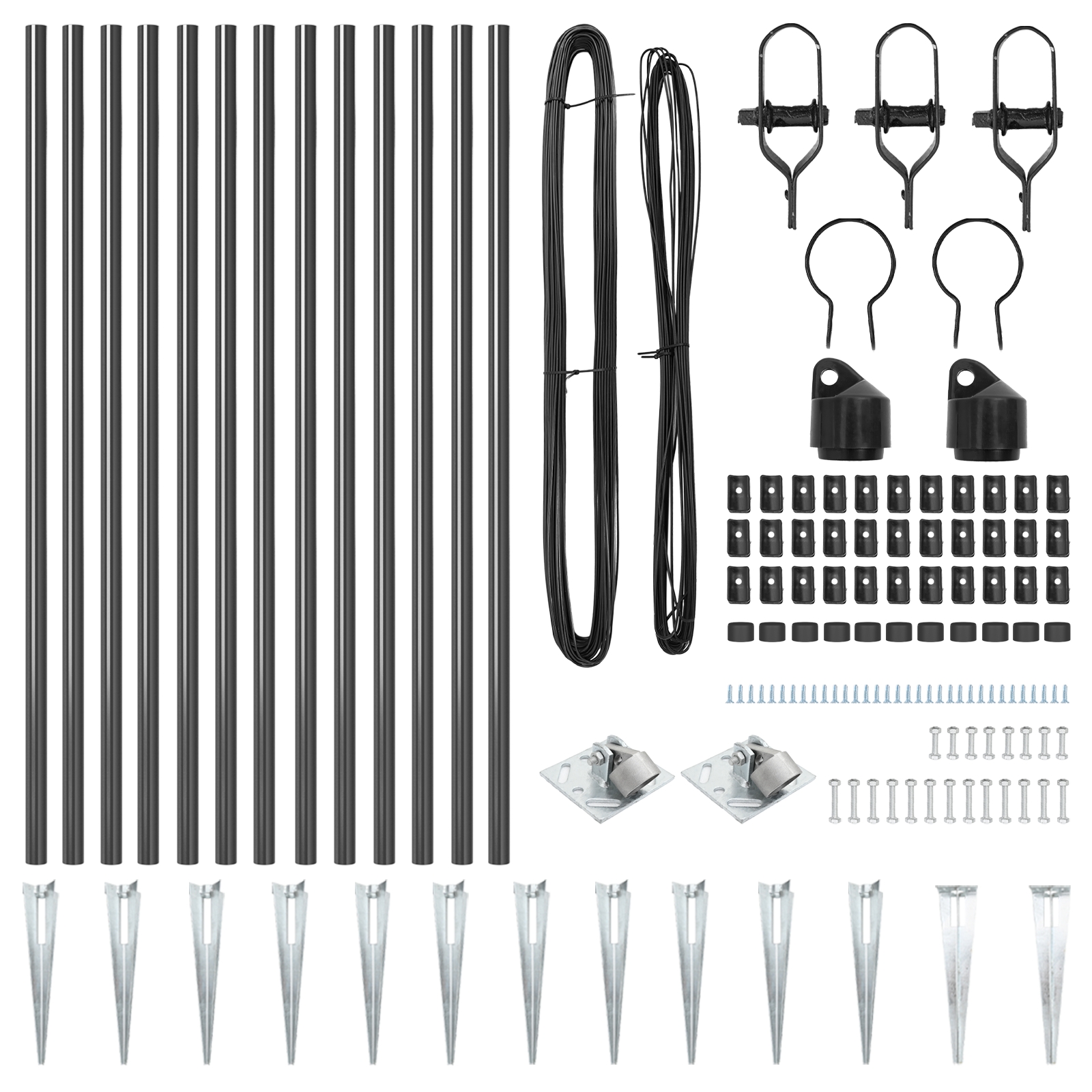 - Lieferumfang: 11 x Post, 2 x Winkelpost, 11 x Spike, 2 x Winkelspike, 11 x Kunststoffkappe, 33 x Kunststoff-Spannseilstütze, 33 x Schraube auf dem Kunststoffstützer, 2 x Winkelpost-Kappe, 2 x Winkelpost-Befestigung, 3 x Spannvorrichtung, 1 x 25m Bindedraht, 1 x 80m Spannseil