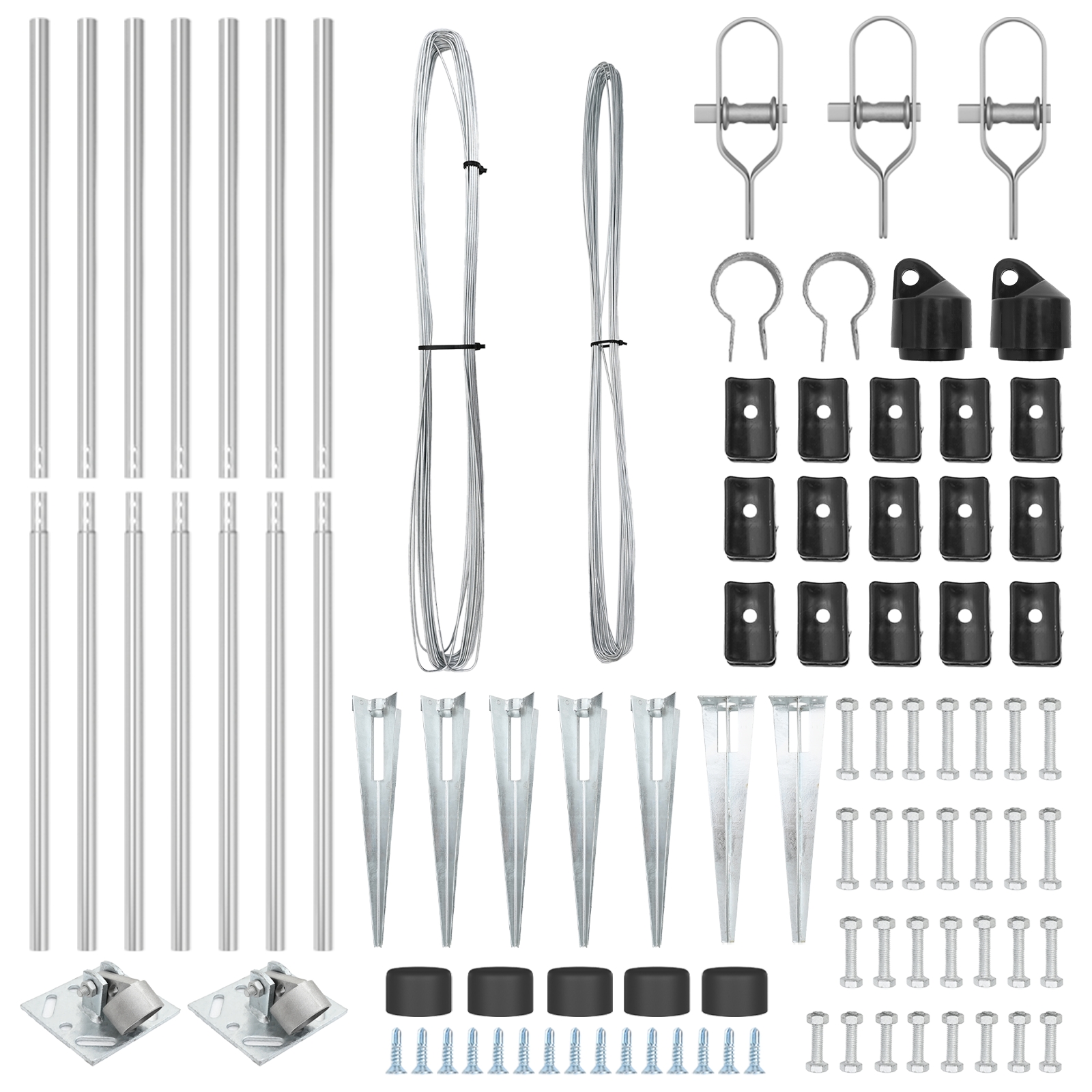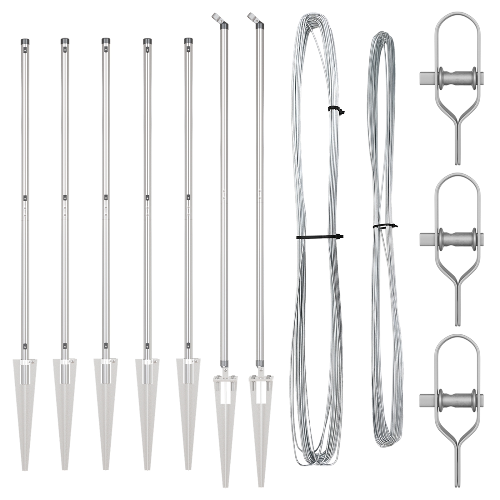 - Lieferumfang: 5 x Pfosten, 2 x Winkelpfosten, 5 x Spike, 2 x Winkelsplitter, 5 x Kunststoffkappe, 15 x Kunststoff-Drahtstütze, 2 x Winkelpfostenbeschläge, 3 x Spannvorrichtung, 1 x 25 m Bindedraht, 1 x 33 m Spanndraht