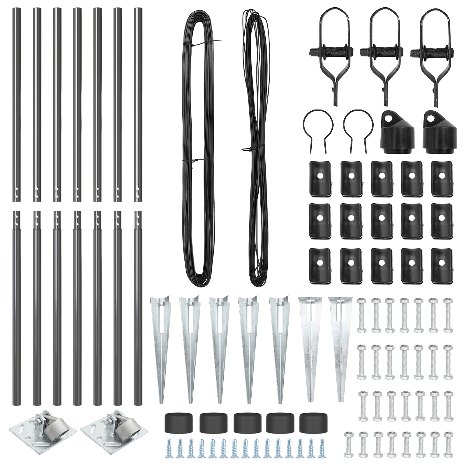 - Lieferumfang: 5 x Pfosten, 2 x Eckpfosten, 5 x Spike, 2 x Eckspike, 5 x Plastikabdeckung, 15 x Plastik-Spannungsdrahtunterstützer, 15 x Schraube am Plastikunterstützer, 2 x Eckpfostenkappe, 2 x Eckpfostenbeschläge, 3 x Spanner, 1 x 25m Bindedraht, 1 x 33m Spannungsdraht