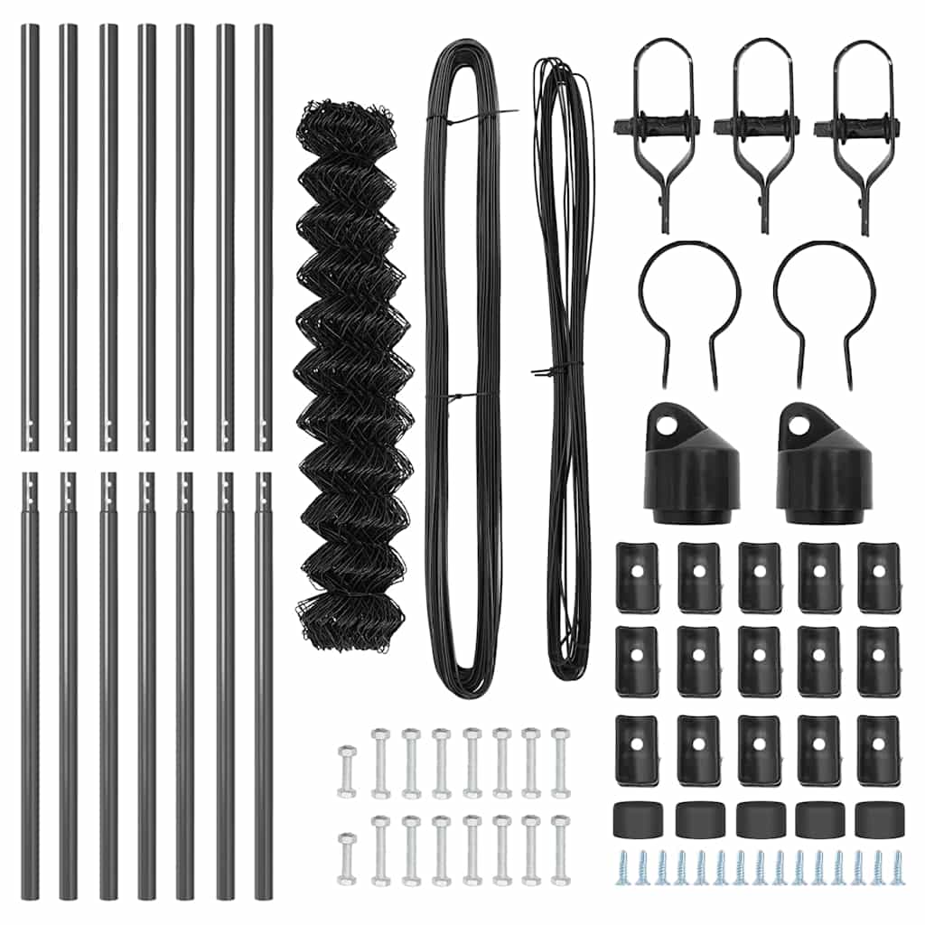 - Lieferumfang: 1 x Kettengliedzaun, 5 x Pfosten, 2 x Winkelpfosten, 5 x Kunststoffkappe, 15 x Kunststoffspannungsdrahtstütze, 2 x Winkelpfostenkappe, 2 x Winkelpfostenhardware, 3 x Spannungsregler, 1 x 25 m Bindedraht, 1 x 33 m Spannungsdraht