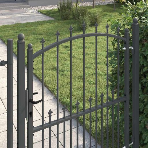 Das moderne Gartentor mit Spitzen setzt einen coolen Akzent in jede Outdoor-Umgebung. Dieses rechteckige Tor mit klaren Linien und schlichtem Stil bietet sowohl optischen Reiz als auch praktische Funktionen. Der pulverbeschichtete Stahl sorgt dafür, dass es wetterfest ist und sich hervorragend für Gärten oder Terrassen eignet. Materialqualität: Hergestellt aus pulverbeschichtetem Stahl, der Widerstandsfähigkeit gegen Witterungseinflüsse garantiert. Dieses Material sorgt für eine glatte Oberfläche, die den modernen Look unterstreicht, und bietet langfristige Haltbarkeit. Seine natürliche Stärke stellt sicher, dass dein Außenbereich zu jeder Jahreszeit sicher bleibt, bei minimalem Pflegeaufwand für ein makelloses Erscheinungsbild. Robuste Schlösser: Mit Riegelschlössern ausgestattet, sorgt das Tor für mehr Sicherheit und verhindert unbefugten Zugang. Diese Schlösser sind stark und kommen mit einem Schlüssel, was sie besonders für schwere Türstrukturen geeignet macht. So bleibt der Garten und die Terrasse auch dann geschützt, wenn sie nicht im Blick sind, und es sind drei passende Schlüssel mit dabei. Architektonischer Stil: Der gewölbte Oberteil kombiniert mit schicken Spitzen bietet eine stilvolle Absperrung, die dein Eigentum aufwertet. Dieses Design-Element erhöht nicht nur die visuelle Anziehungskraft, sondern bietet auch einen zusätzlichen Schutz gegen das Klettern. Die Balance zwischen Form und Funktion macht das Tor in verschiedenen Außenbereichen einsetzbar. Komplettpaket: Geliefert mit zwei stabilen Pfosten und Scharnieren, was die Installation erleichtert. Praktische Montageanforderungen sorgen dafür, dass dein Außenbereich gleichmäßig aussieht. Die Komponenten sind so gestaltet, dass sie einfach zu bedienen und langlebig sind und eine zuverlässige Funktionalität bieten. Pflegehinweise: Halte die Eleganz einfach, indem du es mit einem feuchten Tuch abwischst. Diese einfache Pflege-Routine sorgt dafür, dass das Tor genauso gut aussieht wie am ersten Tag, mit minimalem Aufwand.